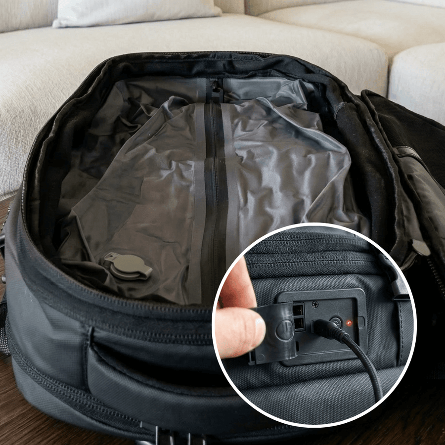 The Rydepak™ has a built-in inner vacuum liner and a USB-powered electric pump mounted on the side panel. When you're ready to ride, plug in the pump and press the button — it compresses the inner compartment in seconds, reducing bulk by up to 40%. When you arrive and want to unpack, the bag self-inflates back to full size.